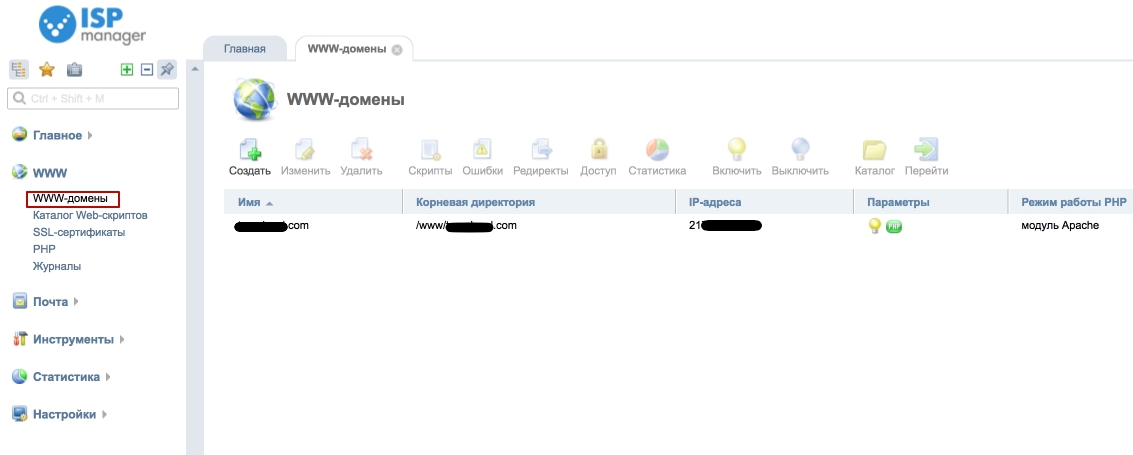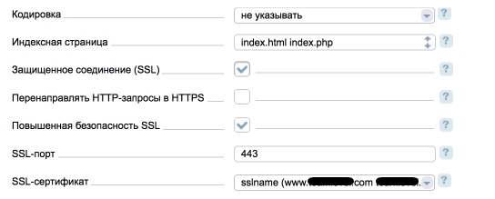 - Кликаем дважды на наш домен. Необходимо поставить галочку на “Защищенное соединение (SSL)” В разделе “SSL-сертификат” выбираем наш только что установленный сертификат.