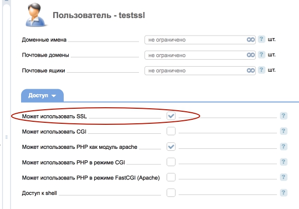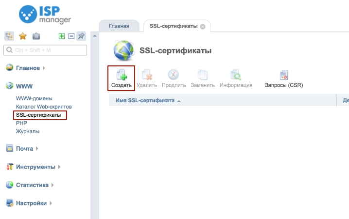 - Переходим на уровень пользователя и сразу в раздел “SSL-сертификаты”. Нажимаем “Создать”: